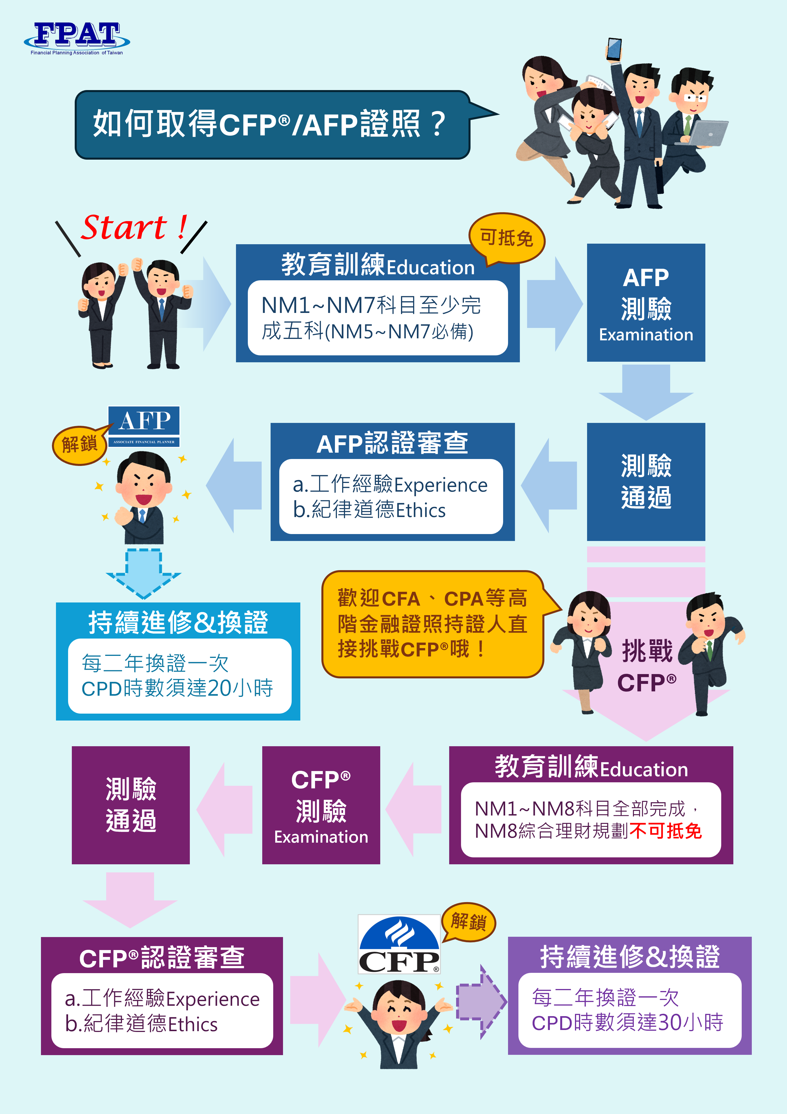 取得本會 AFP 認證,將可進階成為 CFP® 國際認證,只要再完成 CFP® 認證制度中NM8「綜合理財規劃」之教育訓練課程,通過該科目測驗,並符合 CFP® 工作經驗規定與紀律道德要求,即可取得 CFP® 認證。