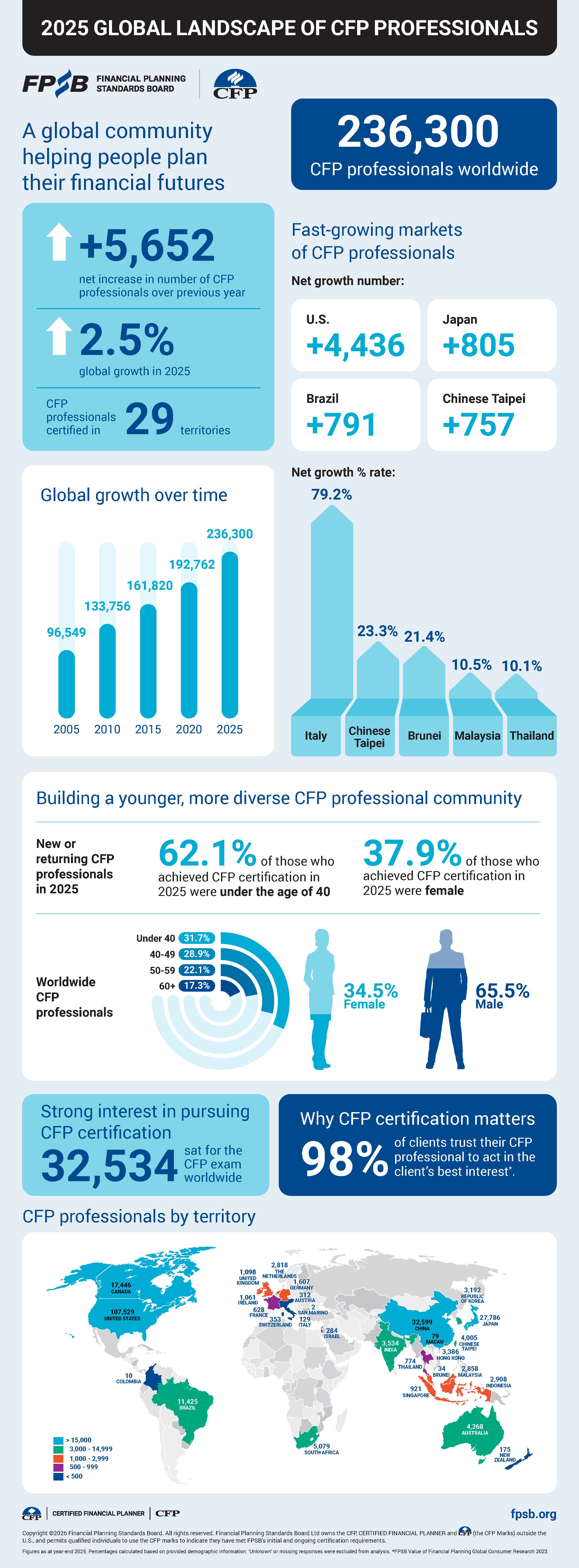 - 至2025年12月,目前全球29個國家有 236,300人持有 CFP® 國際金融專業證照,以美國 (107,529人)為持證人最多的國家,亞洲地區 CFP® 持證人數,中國大陸 (32,599人)、日本 (27,786人)、澳洲(4,268人)、印度 (3,534人)、香港 (3,386人)、韓國 (3,192人)、馬來西亞 (2,858人)。*全球各國 CFP® 認證人數 (FPSB 統計至2025年)*